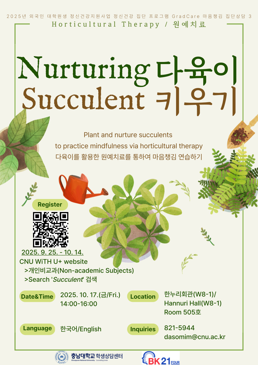 1. 관련: 학생상담센터-2928(2025. 8. 27.) 「[4단계BK21대학원혁신사업] 2025학년도 ‘GradCare’프로그램 운영 수정 계획(안)」 2. 학생상담센터에서는 외국인 유학생의 스트레스 관리를 위하여 다육이를 활용한 원예치료 기반의 마음챙김 프로그램을 다음과 같이 운영하니, 각 대학(원) 및 학과에서는 관심 있는 학생들이 신청할 수 있도록 안내하여 주시기 바랍니다. 가. 모집대상: 재학 외국인 유학생 나. 모집인원: 10명(선착순 모집) 다. 모집일정: 2025. 9. 25.(목) ~ 10. 14.(화) 라. 운영일정: 2025. 10. 17.(금) 14:00-16:00 마. 장 소: 한누리회관(W8-1) 505호 바. 운영언어: 한국어 및 영어 사. 신청링크: https://with.cnu.ac.kr/ 아. 세부내용: <붙임 1> 참고 |