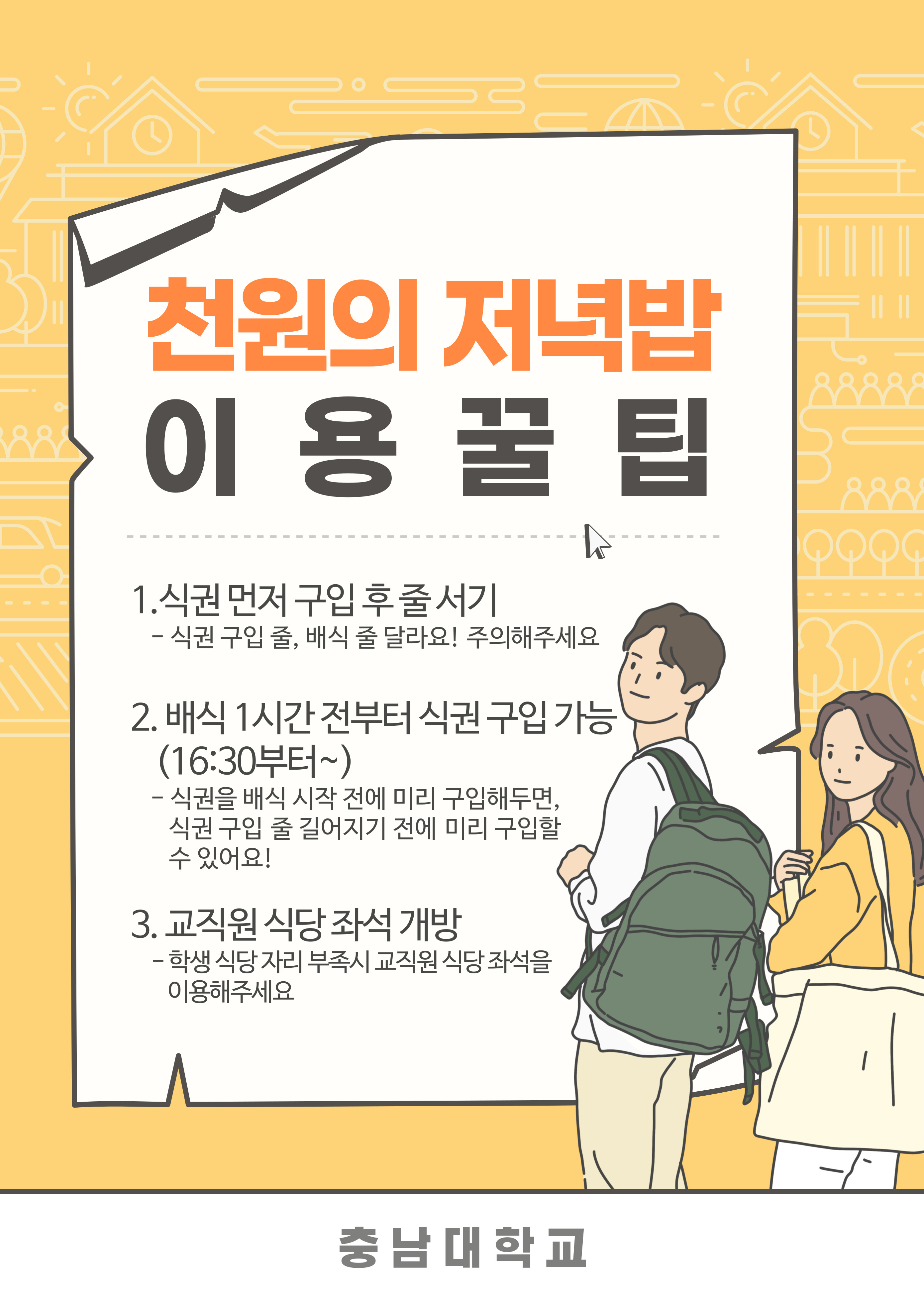 시험기간 시간과 여건 부족 등으로 인해 끼니를 거르는 학생들에게 저렴한 가격에 식사를 제공하고자 다음과 같이 「천원의 저녁밥」을 운영하오니, 각 기관 및 학과에서는 많은 학생들이 이용할 수 있도록 안내하여 주시기 바랍니다. 1. 운영기간: 2025. 10. 13.(월) ~ 10. 16.(목) 17:30 ~ 19:00 (석식) 2. 운영장소: 제2학생회관 학생식당 3. 운영내용: 개인부담 1,000원에 제공 (단가 4,000원 상당) 4. 배식메뉴: (월)짜장덮밥 / (화)부대찌개 / (수)참치김치덮밥 / (목)소고기볶음밥 5. 협조사항: [붙임1] 홍보물을 기관(단과대학) 및 학과 온․오프라인 게시판에 안내 붙임 1. 「천원의 저녁밥」 홍보물(시간․장소․메뉴 등) 1부. 끝. 2. 「천원의 저녁밥」 홍보물(이용꿀팁) 1부. 끝. |