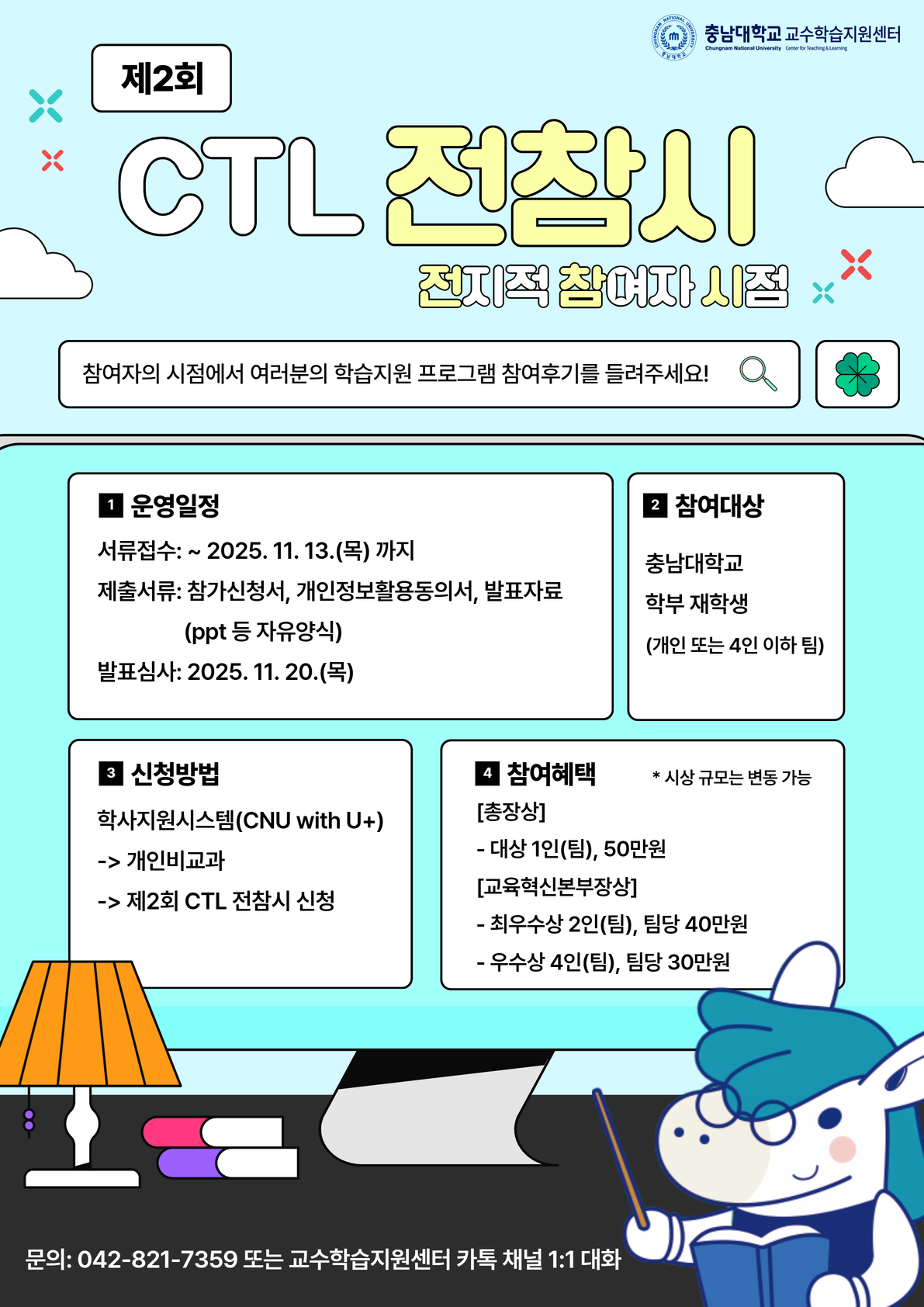 1. 관련: 교수학습지원센터-3645(2025. 10. 13.)「[육성] 제2회 CTL 전참시(전지적 참여자 시점) 운영 계획(안)」 2. 학생 간 상호 소통의 장 마련과 향후 학습지원 프로그램 참여 활성화를 위한 제2회 CTL 전참시(전지적 참여자 시점)를 아래와 같이 개최하오니 각 대학(학과)에서는 재학생이 참여할 수 있도록 홈페이지 및 커뮤니티 등 여러 방면으로 홍보하여 주시기 바랍니다. 가. 참여대상: 충남대학교 학부 재학생(개인 혹은 4인 이하로 구성된 팀) 나. 신청기간: 2024. 10. 16.(목) ~ 11. 13.(목)까지 다. 신청방법: 충남대학교 학사지원시스템(https://with.cnu.ac.kr) 라. 주요내용: 교수학습지원센터 학습지원 프로그램 중 다른 학생에게 공유하고 싶은 프로그램에 대한 참여후기를 CNU Edu-Fair 때 발표 자료를 활용하여 발표하고 심사를 통하여 우수작에 대한 시상 및 시상금 지급 마. 시상내용: 심사기준에 따라 발표 심사 후 고득점 순으로 대상 1팀, 최우수상 2팀, 우수상 4팀 선정(시상금 총 250만원) 3. 아울러 대외협력실에서도 학교 홈페이지에 게재하여 학내 구성원에게 홍보하여 주시기 바랍니다. 붙임 1. 2025학년도 제2회 CTL 전참시(전지적 참여자 시점) 안내문 1부. 2. 2025학년도 제2회 CTL 전참시(전지적 참여자 시점) 포스터 1부. 끝. |