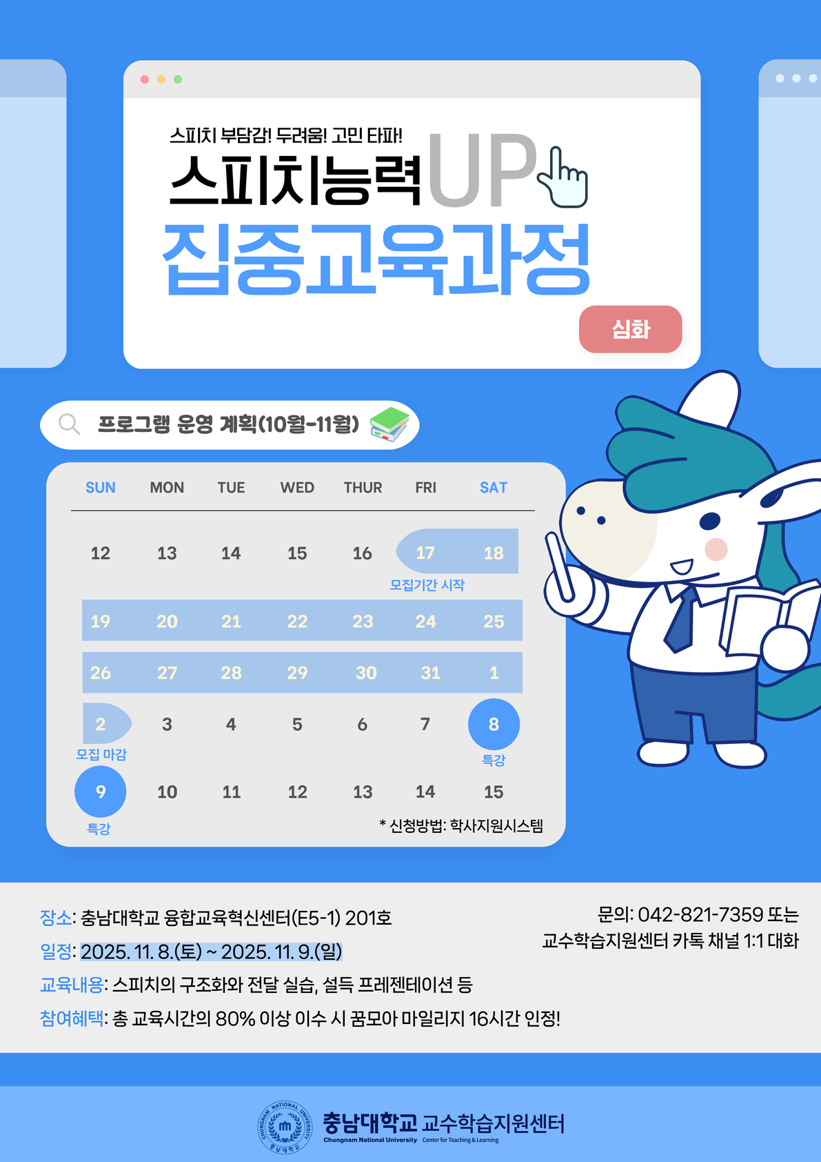 1. 관련: 교수학습지원센터-3644(2025. 10. 13.) 「[육성] 2025학년도 스피치 능력UP 집중 교육 과정(심화) 운영 계획(안)」 2. 스피치에 대한 심화 이론과 실습을 통해 표현력과 전달력을 향상시키고, 학생들의 전문적 스피치 역량 강화를 위한 스피치 능력UP 집중 교육 과정(심화) 프로그램을 아래와 같이 실시하오니 대학(학과)에서는 소속 학생들이 프로그램에 참여할 수 있도록 홍보하여 주시고, 대외협력실에서는 학교 홈페이지에 게시하여 주시기 바랍니다. 가. 모집대상: 충남대학교 학부 재학생 20명(선착순) 나. 접수기간: 2025. 10. 17.(금) ~ 11. 2.(일) 다. 접수방법: 학사지원시스템 접속(http://with.cnu.ac.kr)→로그인(CNU포털과 동일한 아이디/비밀번호)→비교과프로그램→개인비교과 신청→‘스피치 능력UP 집중 교육 과정(심화)’ 검색 후 신청 라. 교육기간: 2025. 11. 8.(토) ~ 11. 9.(일) - 양일 모두 참여 가능한 학생만 신청 1) 1회차: 2025. 11. 8.(토) 09:00~18:00 2) 2회차: 2025. 11. 9.(일) 09:00~18:00 마. 운영방법: 대면 진행(융합교육혁신센터 201호) 바. 주요내용: 스피치의 구조화와 전달 실습, 설득 프레젠테이션 등 사. 문 의: 교수학습지원센터(내선 7359) 붙임 1. 2025학년도 스피치 능력UP 집중 교육 과정(심화) 안내문 1부. 2. 2025학년도 스피치 능력UP 집중 교육 과정(심화) 홍보 포스터 1부. 끝. |